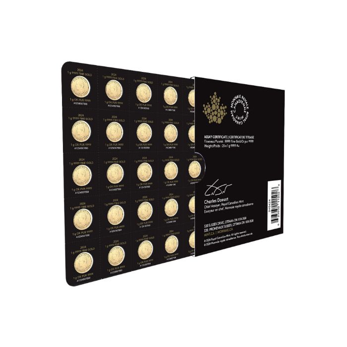 The Maplegram25™ Coin Sheet is a set of 25 coins individually displayed in lines. Each coin weighs 1 gram, accounting for 25 grams of 99.99% pure gold. The coins are brand-new, carefully selected, and placed in the divisible blister packs, allowing individual manipulation of the coins once the original Mint seal is removed.