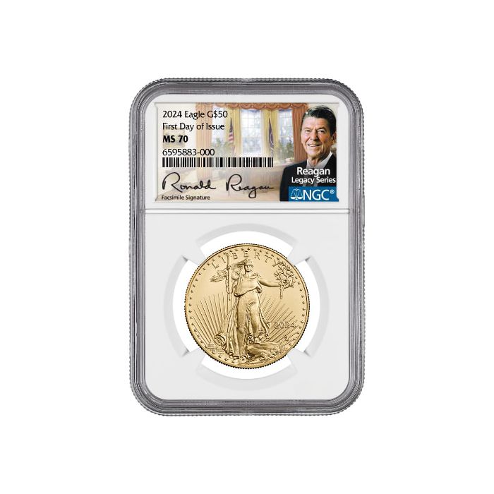Today, you can purchase, at SD Bullion, 2024 1 oz American Gold Eagle Coins from those sold on the first day of issue in the US Mint, certified as MS-70 samples and sealed by the NGC with an Exclusive Ronald Reagan Facsimile Signature label with his portrait overlaying the Oval Office.