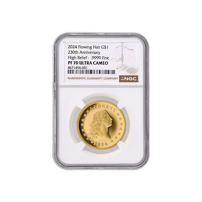 SD Bullion now offers the 2024 1 oz US 230th Anniversary Flowing Hair High Relief Proof Gold Coin, graded PF-70 by NGC.