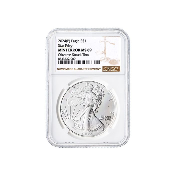 Purchase the 2024-(P) NGC MS-69 Star Privy 1 oz American Silver Eagle Coin Mint Error Struck Thru online from SD Bullion.