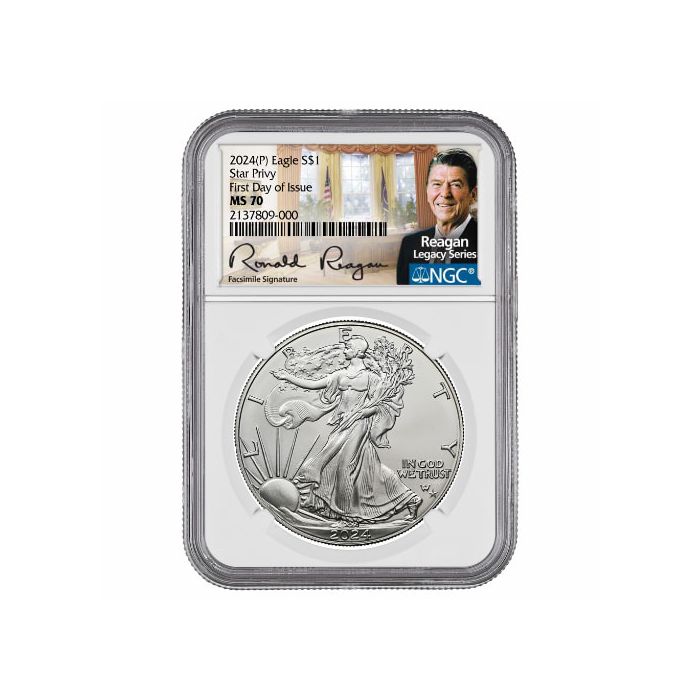 Buy 2024-(P) NGC MS-70 First Day of Issue Star Privy 1 oz American Silver Eagle Coin - Exclusive Reagan Label at SD Bullion