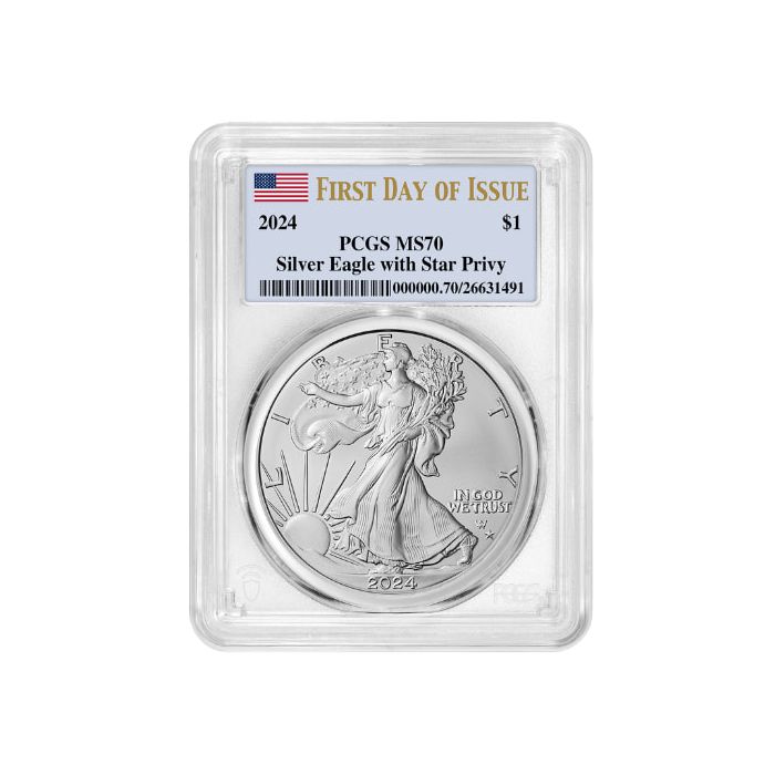 Buy 2024-(P) PCGS MS-70 First Day of Issue Star Privy 1 oz American Silver Eagle Coins at SD Bullion