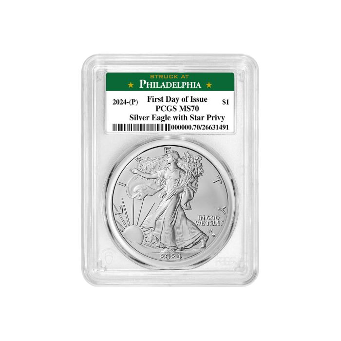 Purchase the 2024-(P) PCGS MS-70 First Day of Issue Star Privy 1 oz American Silver Eagle Coin - Philadelphia Label online from SD Bullion.