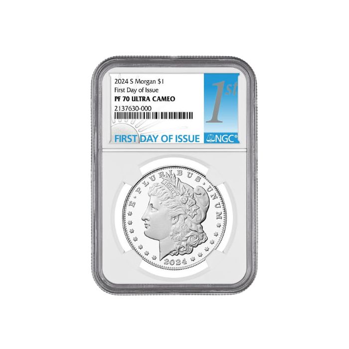 SD Bullion offers 2024-S Morgan Silver Dollars, purchased from the US Mint on the first day of their official release. They are graded as PF-70 UC coins and sealed in NGC slabs with the First Day of Issue Label.