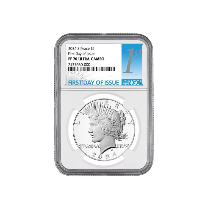 Today, SD Bullion offers 2024-S Peace Dollar Proof Silver Coins, purchased from the US Mint on day #1 of their official release. They are graded as PF-70 UC samples and sealed with First Day of Issue Labels in NGC slabs.