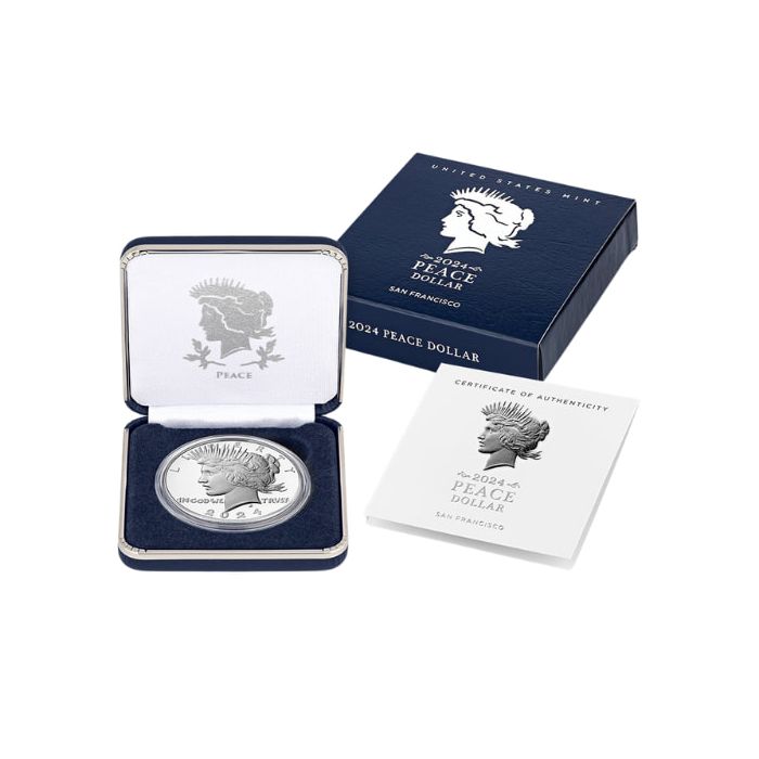 You can acquire 2024-S Peace Dollar Proof Silver Coins housed in an original mint Box with a Certificate of Authenticity at SD Bullion.
