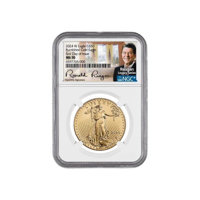 Order the 2024-W NGC MS-70 First Day of Issue 1 oz American Gold Eagle Burnished Coin with our Exclusive Reagan Label online, 24/7, from SD Bullion.
