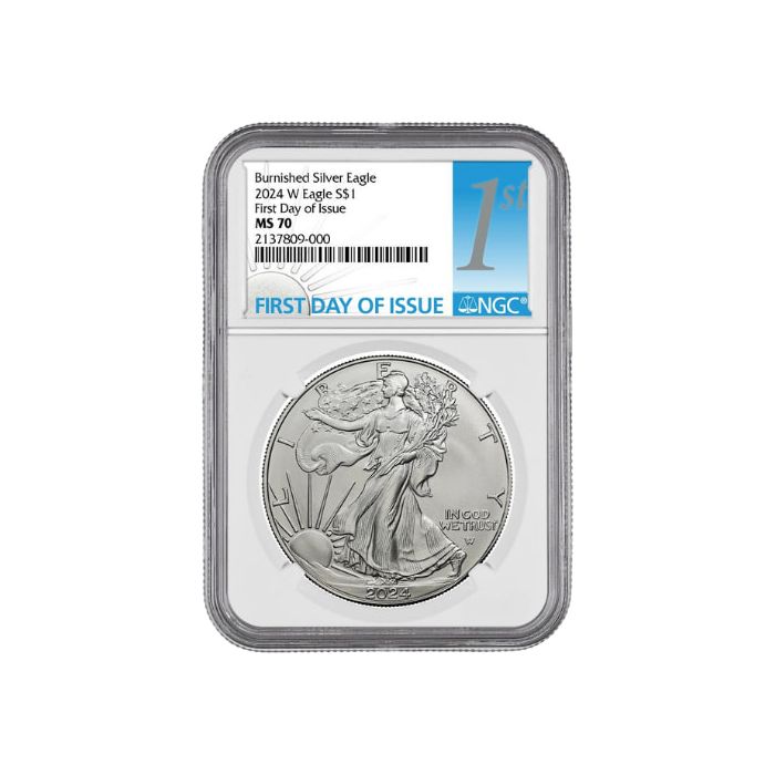 Today, SD Bullion offers 2024-W 1 oz Burnished American Silver Eagles, taken among those available for purchase in the US Mint on day #1, sealed and certified by NGC as an MS-70 coin.