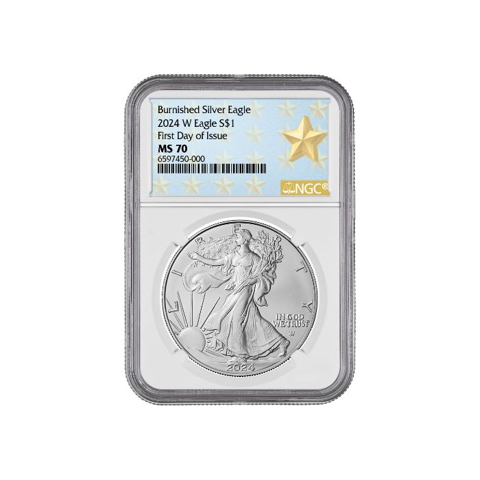 Today, SD Bullion offers 2024-W 1 oz Burnished American Silver Eagles, taken among those available for purchase in the US Mint on day #1, graded as MS-70 coins and sealed in NGC slabs with the Exclusive West Point Label