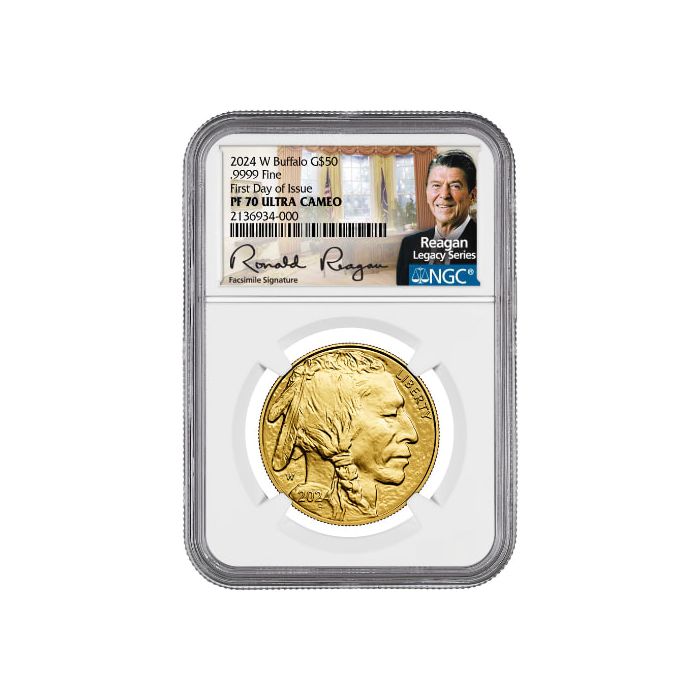 You can acquire 2024-W 1 oz American Gold Buffalo Coins, among those made publicly available on the first day by the US Mint, certified by NGC as PF-70 coins and sealed with our exclusive Ronald Reagan Facsimile Signature label with his portrait overlaying the Oval Office.