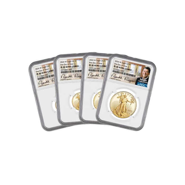 Purchase the 2024-W NGC PF-70 UC FDI Proof Gold Eagle 4-Coin Set with Exclusive Ronald Reagan Label online from SD Bullion.