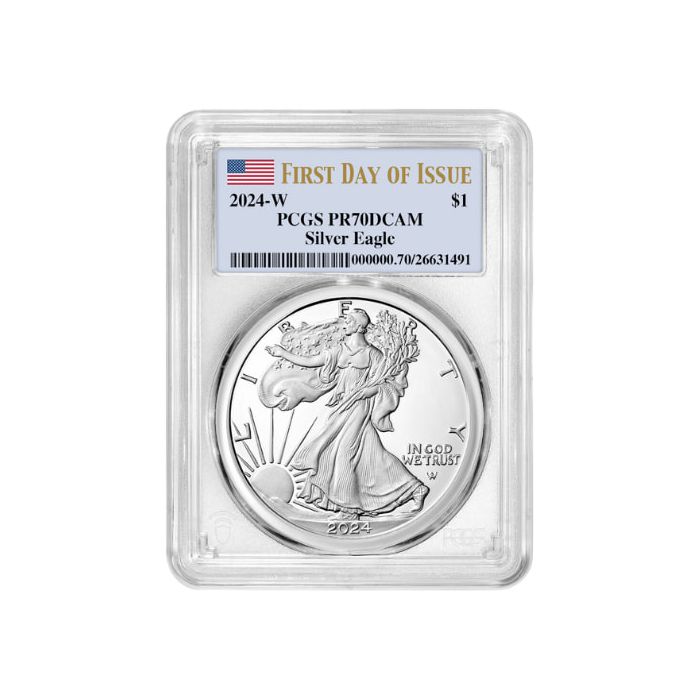 Enrich your assets with 2024-W PCGS PR-70 First Day of Issue 1 oz American Silver Eagle Proof Coins.