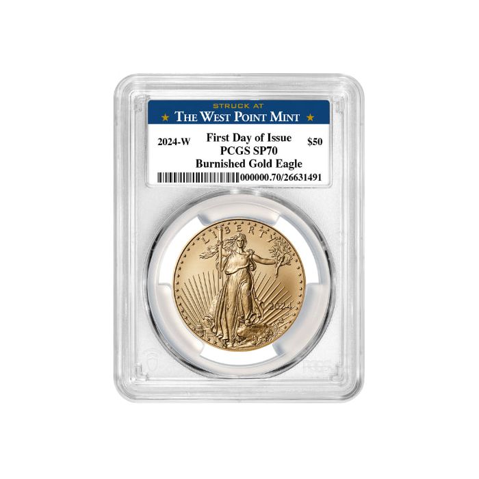 Order the 2024-W PCGS SP-70 First Day of Issue 1 oz American Gold Eagle Burnished Coin with the Exclusive West Point Label online, 24/7, from SD Bullion.