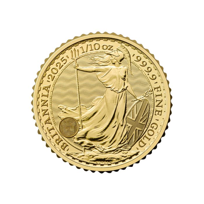 The reverse inscriptions read “‘BRITANNIA’ 2025’ 1/10 oz’ 999.9’ FINE’ GOLD,” describing the coin’s name, year, weight, purity, and metal content.