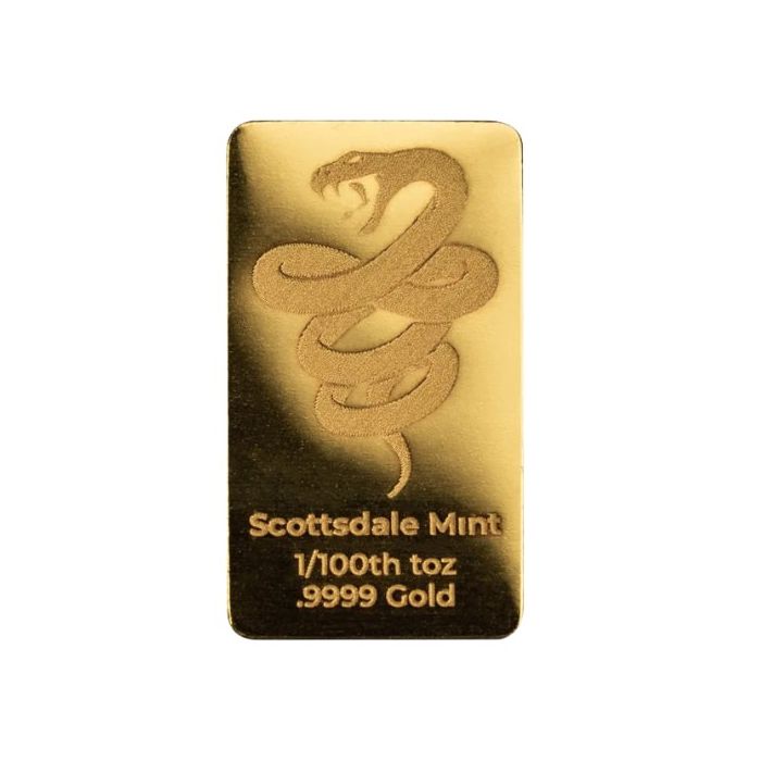 Celebrating the Year of the Dragon in 2024 and now the Year of the Snake in 2025, the Scottsdale Mint introduces the 1/100 oz Lunar Snake Gold Bar.