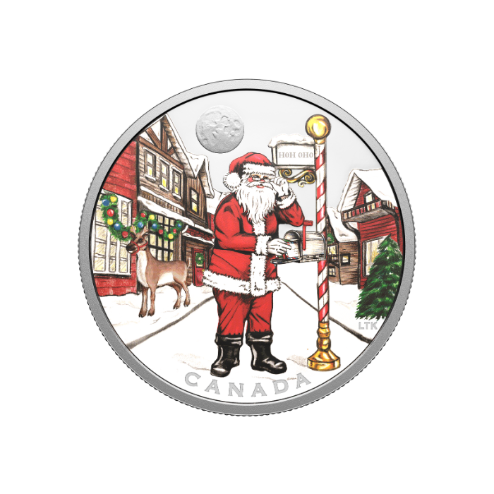 The Dear Santa coin reveals a heartwarming winter scene of Santa collecting letters from children around the world, enhanced by vibrant color and special fluorescent effects that illuminate under black light. With its proof finish and fine detailing, this limited-edition release from the Royal Canadian Mint is a perfect addition to both numismatic and holiday collections.
