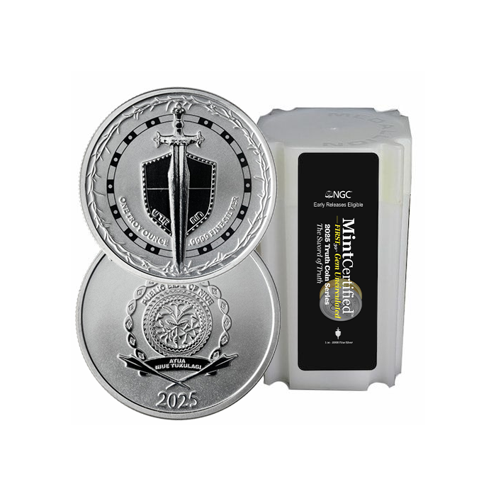 Secure a pristine tube of 2025 1 oz Silver Sword of Truth coins, sealed and certified under the MintCertified™ FIRST30 program. These coins are preserved in unopened mint tubes from the first 30 days of release, ensuring their early-strike pedigree.