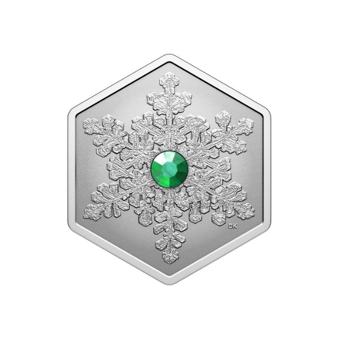The reverse features an exquisitely detailed snowflake rendered with frosted artistry and crystalline precision. A vibrant green Swarovski® crystal gleams at the center, representing the radiant beauty of nature’s most delicate masterpiece. Designed by artist Derek Wicks, the snowflake’s structure is a tribute to the uniqueness of each flake that graces a Canadian winter.