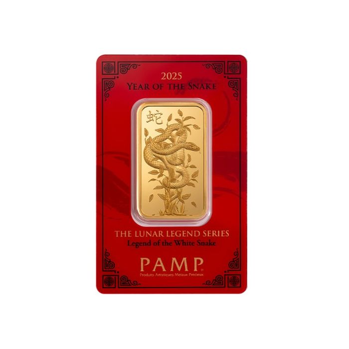 Today, you can acquire the 2025 1 oz White Snake Gold Bar from PAMP’s Lunar Legends Series at SD Bullion.