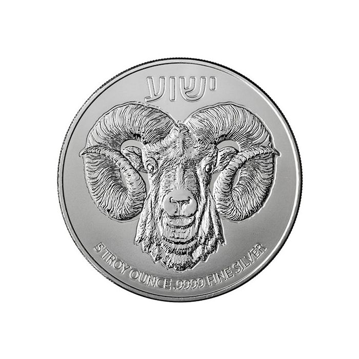 The reverse showcases a frontal close-up of a Ram. The Hebrew lettering “ישוע” above the animal’s depiction means Yeshua (Jesus) and identifies it as the Lamb or Son of God, hence the coin’s moniker.