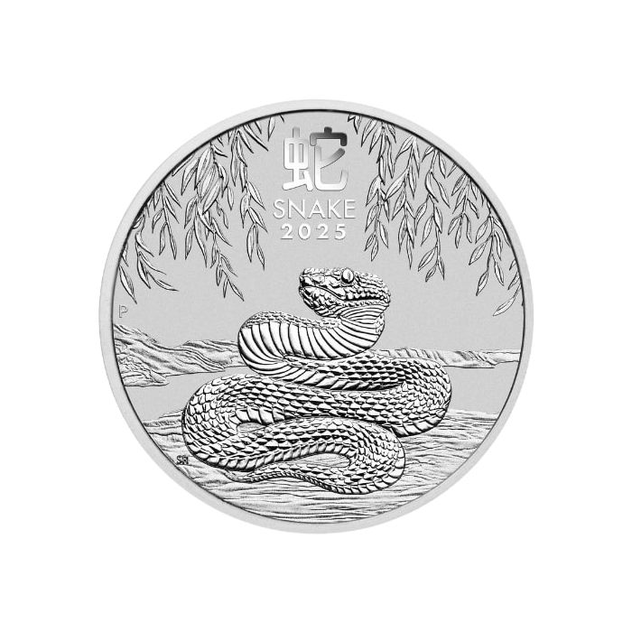 The reverse depicts a snake coiled in a bamboo trunk. It is accompanied by a Chinese character and its translation, “SNAKE,” the year of issuance, “2025,” and a discreet “P” mint mark on the left identifying the Perth Mint.
