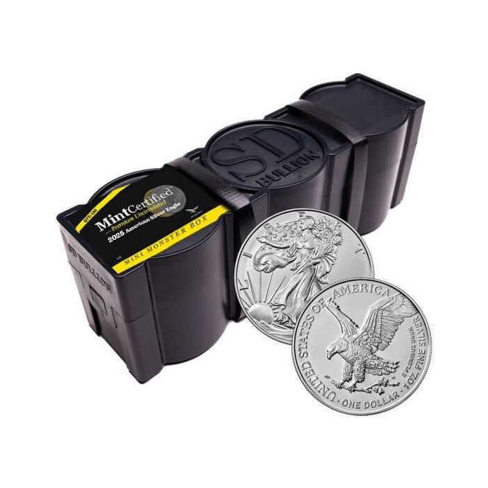 Today, you can acquire the 2025 American Silver Eagles 100-Coin MintCertified™ Premium Uncirculated Mini Monster Box at SD Bullion.