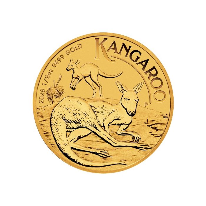 In addition to the kangaroo’s image, the reverse side includes engravings with the series name “KANGAROO " and “2025 ½ oz 9999 GOLD,” detailing the year of mintage, weight, purity, and metal content.