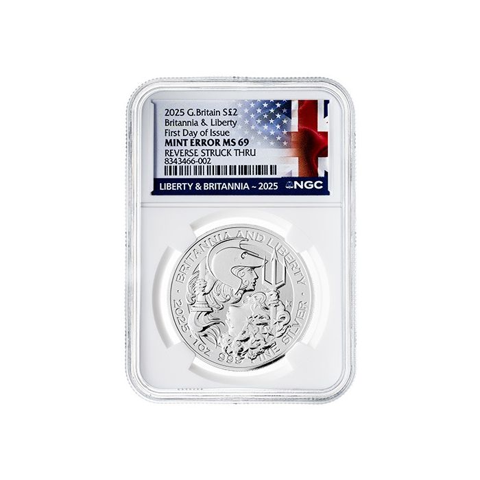 Purchase the 2025 NGC MS-69 First Day of Issue 1 oz British Silver Britannia and Liberty Coin with Mint Error online from SD Bullion 24/7.