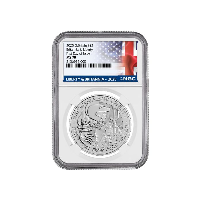 Exclusively at SD Bullion, you can find 2025 1 oz British Britannia and Liberty Silver Coin sealed in NGC slabs and graded as MS-70 First Day of Issue.