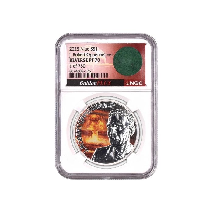 Today, SD Bullion sells 2025 1 oz J. Robert Oppenheimer Reverse Proof Silver Coins, housed in NGC slabs and graded as a PF-70 sample.