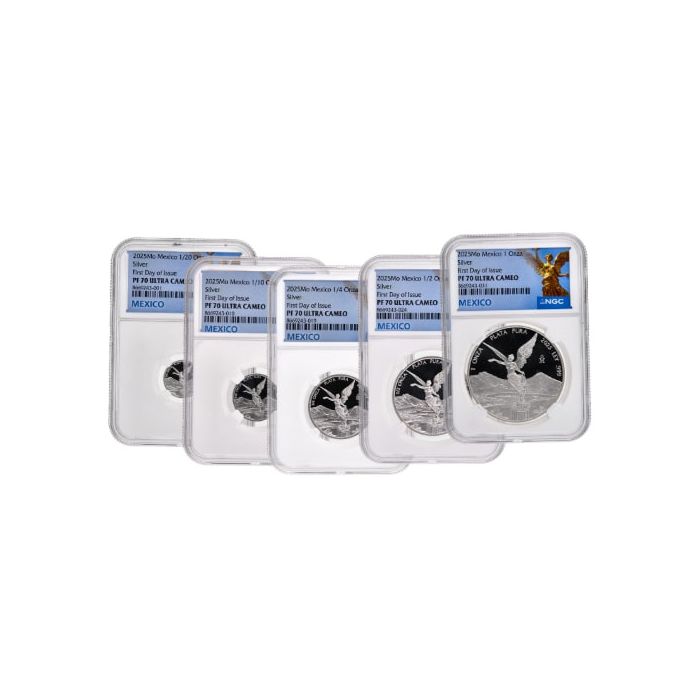 The Mexican Silver Libertad Proof series represents one of the most prestigious annual issues in modern world coinage. Coveted for its low mintages, rich symbolism, and brilliant proof finish, the series has become a cornerstone for discerning collectors. This complete 5-Coin Proof Set, certified by NGC as PF-70 Ultra Cameo with the exclusive First Day of Issue pedigree, captures the very best of the 2025 release in flawless condition.