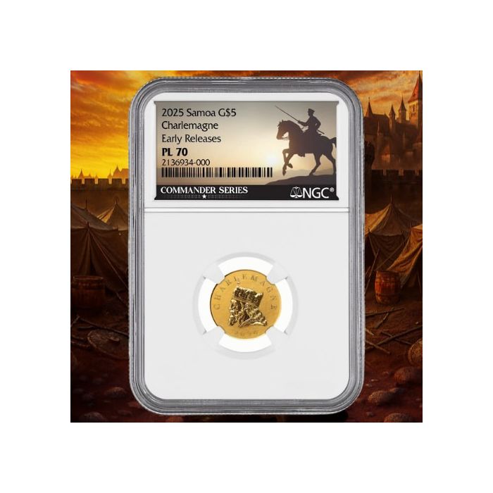 Today, SD Bullion offers the 2025 1/10 oz Charlemagne Gold Coin from the Commander Series. They were purchased from the Scottsdale Mint within 30 days of their official release and submitted to an NGC appraisal, where they were sealed and certified as PL-70.