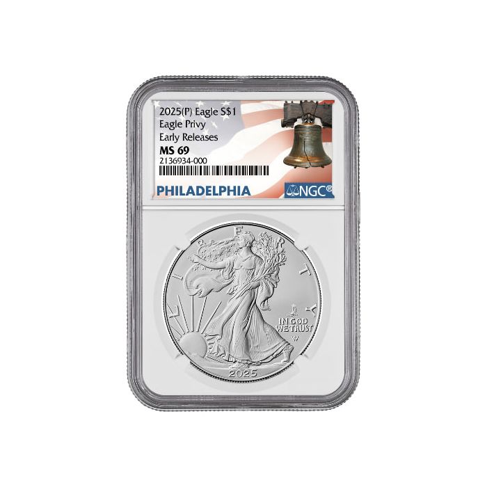 Today, at SD Bullion, you can find 2025-(P) Eagle Privy 1 oz American Silver Eagle Coins purchased from the US Mint within 30 days of their official release. They were graded by NGC as MS-69 Early Releases samples and sealed with their special Philadelphia Liberty Bell Label.