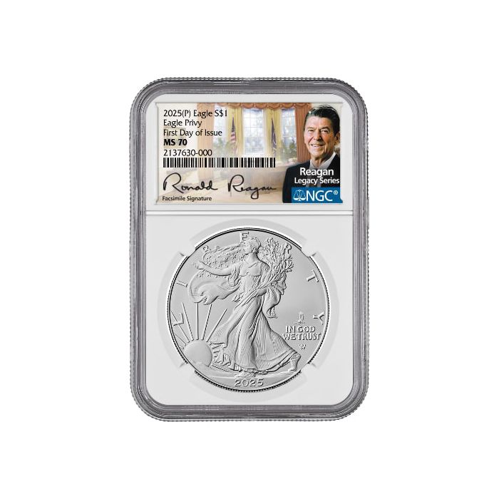 Purchase the 2025-(P) NGC MS-70 First Day of Issue Eagle Privy 1 oz American Silver Eagle Coin - Exclusive Reagan Label online from SD Bullion.