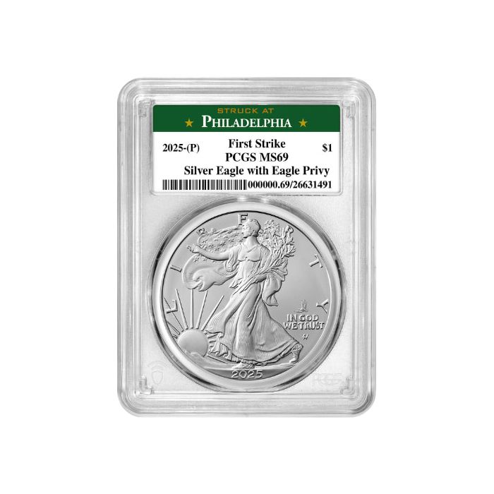 Purchase the 2025-(P) PCGS MS-69 First Strike Eagle Privy 1 oz American Silver Eagle Coin - Philadelphia Label online from SD Bullion.