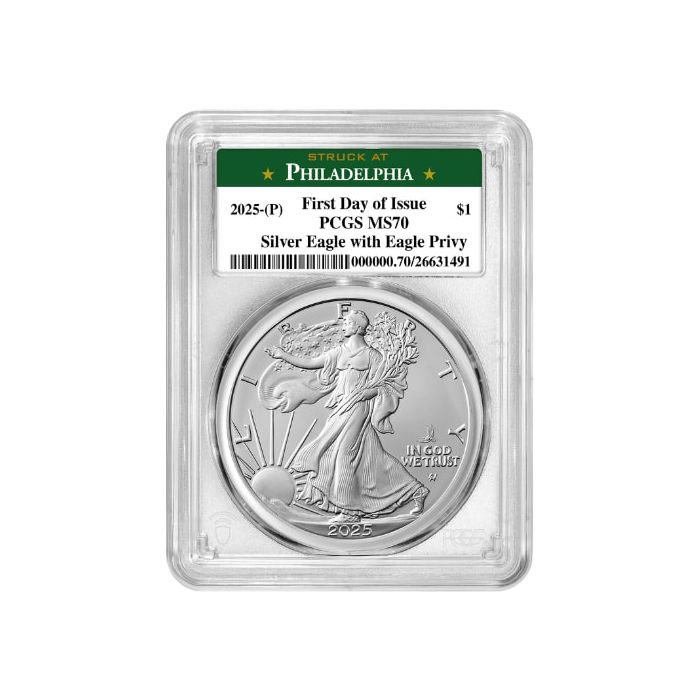 Buy 2025-(P) PCGS MS-70 First Day of Issue Eagle Privy 1 oz American Silver Eagle Coins - Philadelphia Label at SD Bullion