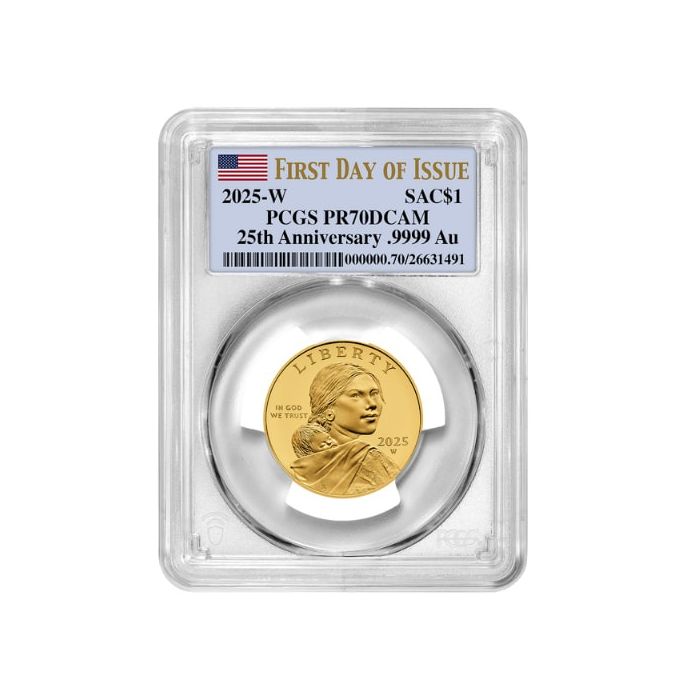 Today, SD Bullion offers 2025 1/2 oz 25th Anniversary Sacagawea Dollar 24k Proof Gold Coins housed in PCGS slabs and graded as PR-70 First Day of Issue samples.