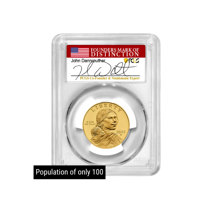 Today, SD Bullion offers 2025 1/2 oz 25th Anniversary Sacagawea Dollar 24k Proof Gold Coins graded as PR-70 First Day of Issue samples, and sealed in PCGS John Dannreuther Signature Label.
