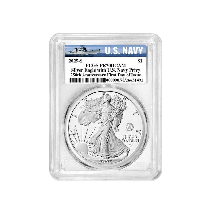 Buy the 2025-S PCGS PR-70 First Day of Issue 250th U.S. Navy Anniversary Privy 1 oz American Silver Eagle Proof Coin – Navy Label at SD Bullion