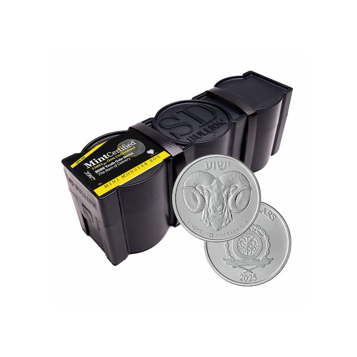 Each Mini Monster Box includes 5 sealed tubes, containing 20 x 1 oz 2025 Silver Ram of Calvary coins, totaling 100 troy ounces of .9999 fine silver.