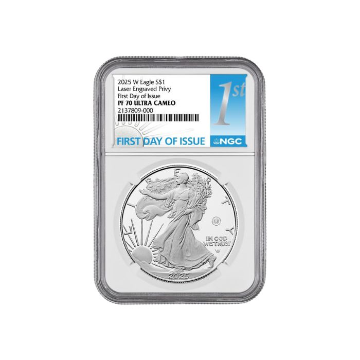 The 2025-W NGC PF-70 First Day of Issue Silver Eagle with U.S. Laser Privy combines a flawless grade, an early pedigree, and a one-year-only privy mark, making it a cornerstone for collectors of modern U.S. coinage. Its combination of beauty, scarcity, and perfection ensures lasting desirability.