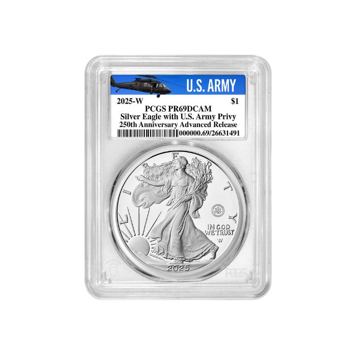 Buy the 2025-W PCGS PR-69 Advanced Releases US Army Privy 1 oz Silver Eagle Proof Coin - Army Label at SD Bullion