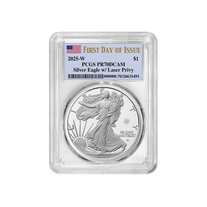 Buy 2025-W PCGS PR-70 First Day of Issue U.S. Laser Privy Silver Eagles at SD Bullion