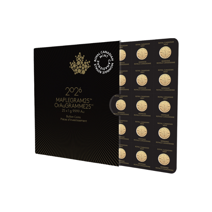 The Maplegram25™ Coin Sheet is a set of 25 coins individually displayed in lines. Each coin weighs 1 gram, accounting for 25 grams of 99.99% pure gold. The coins are brand-new, from the 2026 edition, carefully selected, and placed in the divisible blister pack, allowing individual manipulation of the coins once the original Mint seal is removed.