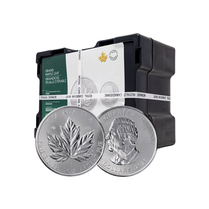 Since its debut in 1988, the 1 oz Silver Maple Leaf (SML) has become one of the most respected and collected bullion coins on the planet — synonymous with purity, security, and craftsmanship. Now, that same prestige is being brought to a larger 5 oz canvas, amplifying every iconic detail of a new Maple Leaf design. Now available in its original, mint-sealed box, this exclusive bulk format offers 36 coins totaling 180 troy ounces of pure Canadian silver.