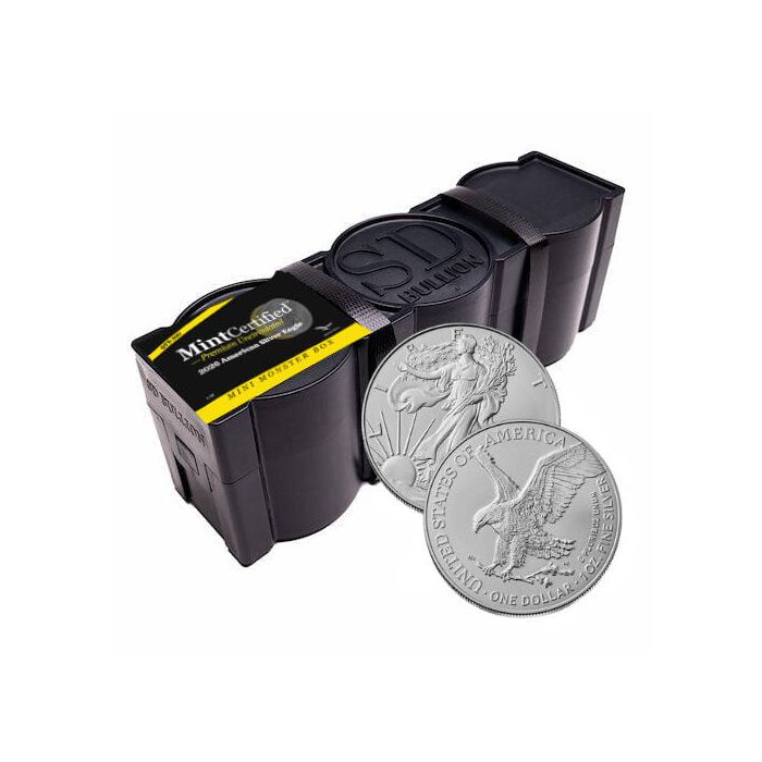 SD Bullion’s MintCertified™ program guarantees the integrity, traceability, and original mint condition of U.S. Mint Silver Eagle tubes. Each Mini Monster Box contains five 20-coin tubes, totaling 100 oz of .999 fine silver, and is compact, secure, and easy to store.