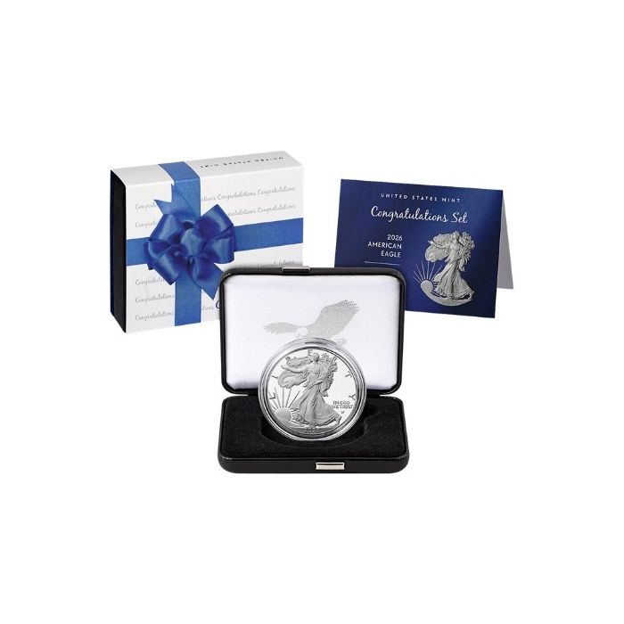 The 2026-P 1 oz American Silver Eagle Congratulations Proof Set consists of a 1 Troy oz American Silver Eagle from the 2026 edition made of .999 fine silver and enhanced with a proof finish.