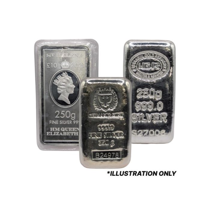 These bars, in particular, are sourced from various reputable mints. They weigh 250 grams, corresponding to approximately 8.037 Troy oz of at least 99.9% fine silver.