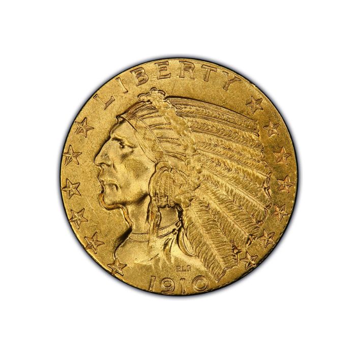 The US Mint issued $5 Indian Head Half Eagle coins from 1908 to 1929. Produced at the Denver, New Orleans, Philadelphia, and San Francisco branches, these coins weigh .2419 oz of gold bullion.