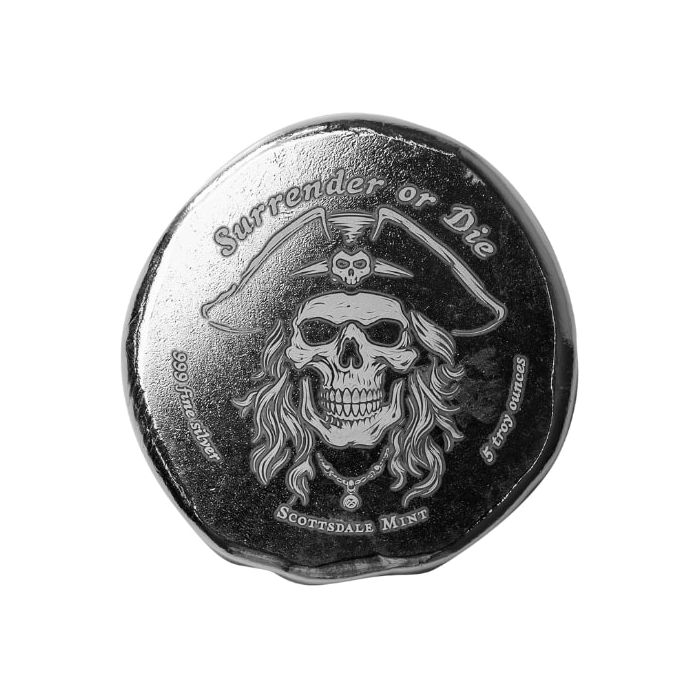 The Scottsdale Mint 5 oz Pirate Skull Silver Round is available for purchase at SD Bullion.